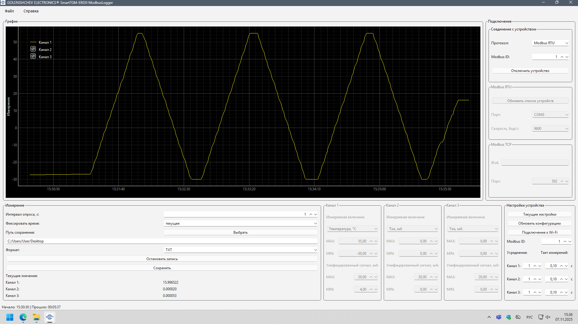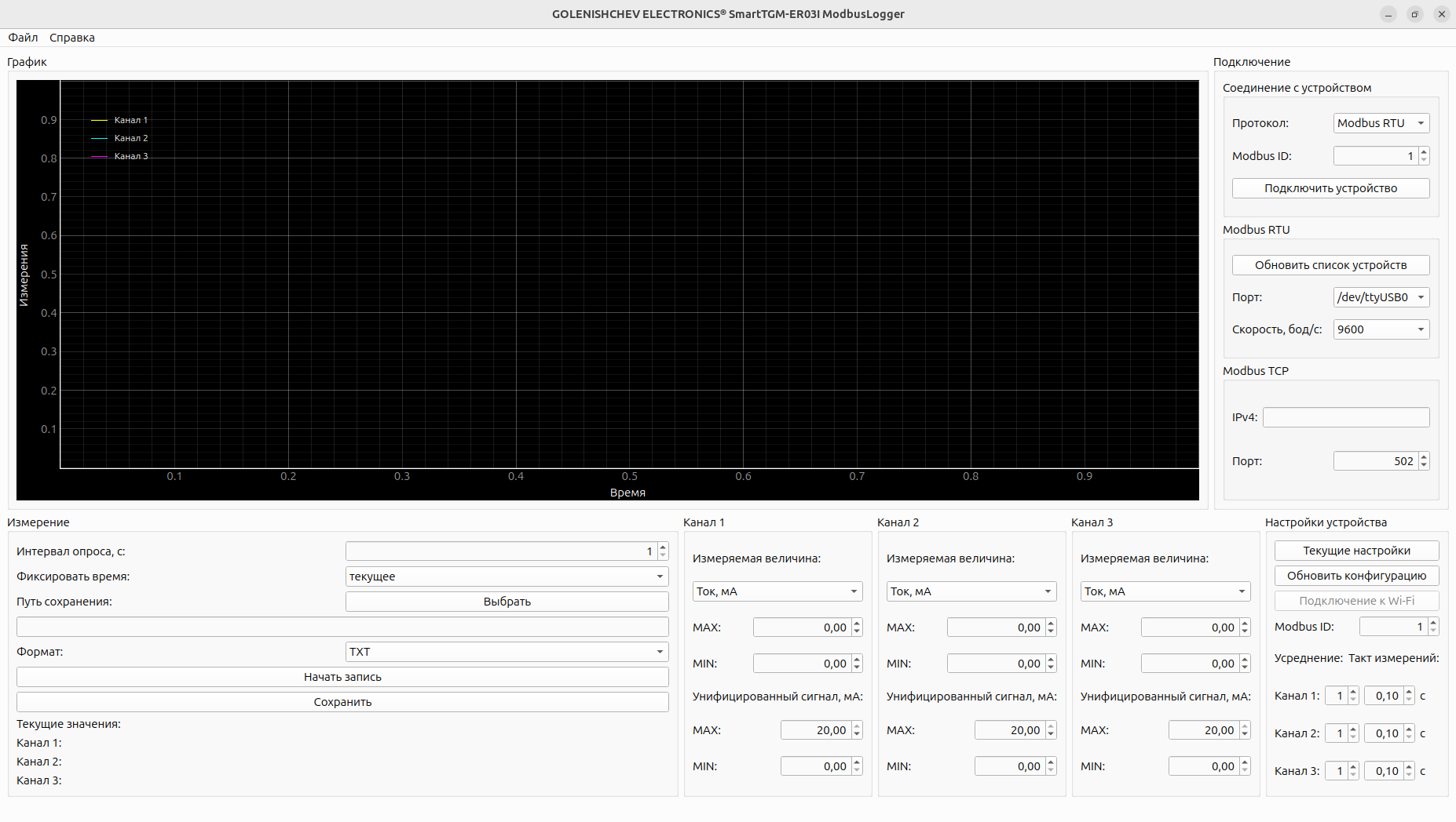 Программа предназначена для настройки параметров контрольно-измерительного оборудования: Трехканальный измеритель тока SmartTGM-ER03I, получения измерений с прибора. Для настройки прибор подключается к ПК через интерфейс USB (с помощью кабеля/преобразователя интерфейса с RS-485) или по локальной сети (Wi-Fi, Ethernet). Параметры задаются согласно руководству по эксплуатации к прибору.