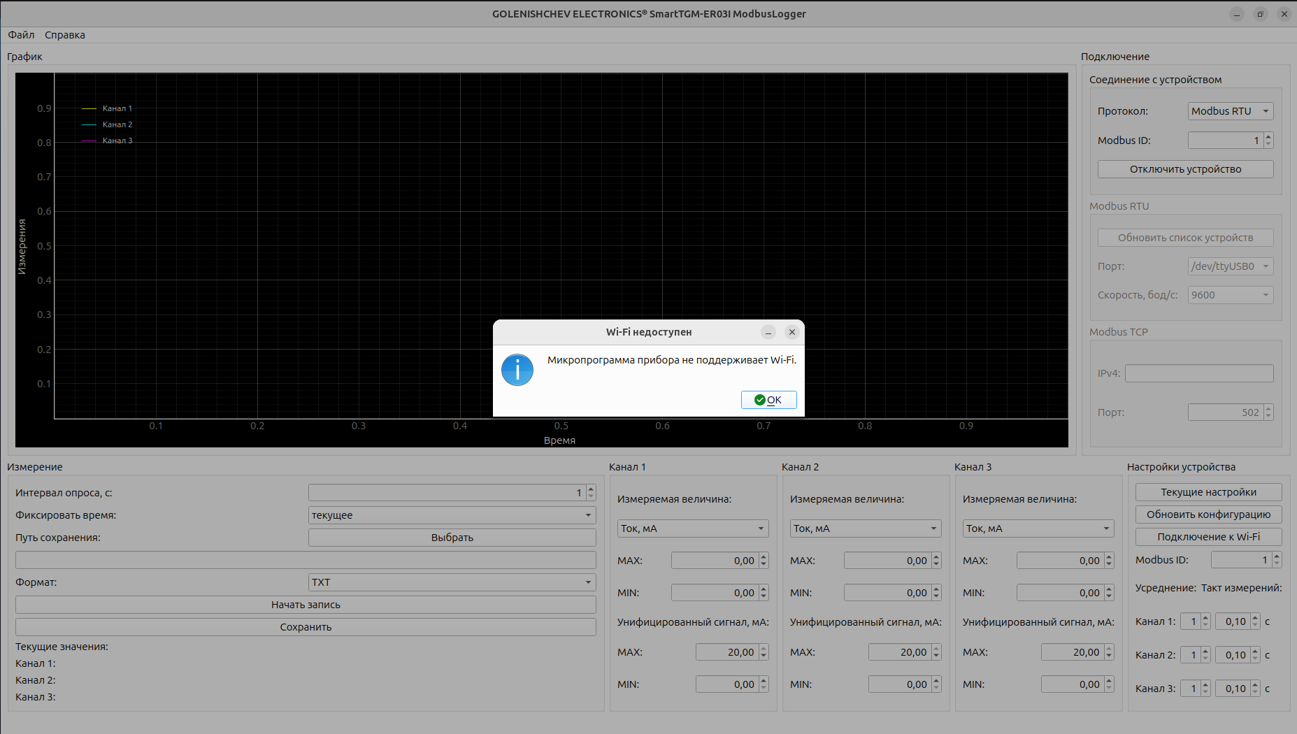 Для подключения устройства к точке доступа Wi-Fi необходимо в программе выбирать именно протокол Modbus RTU (подкючение через последовательный интерфейс)!