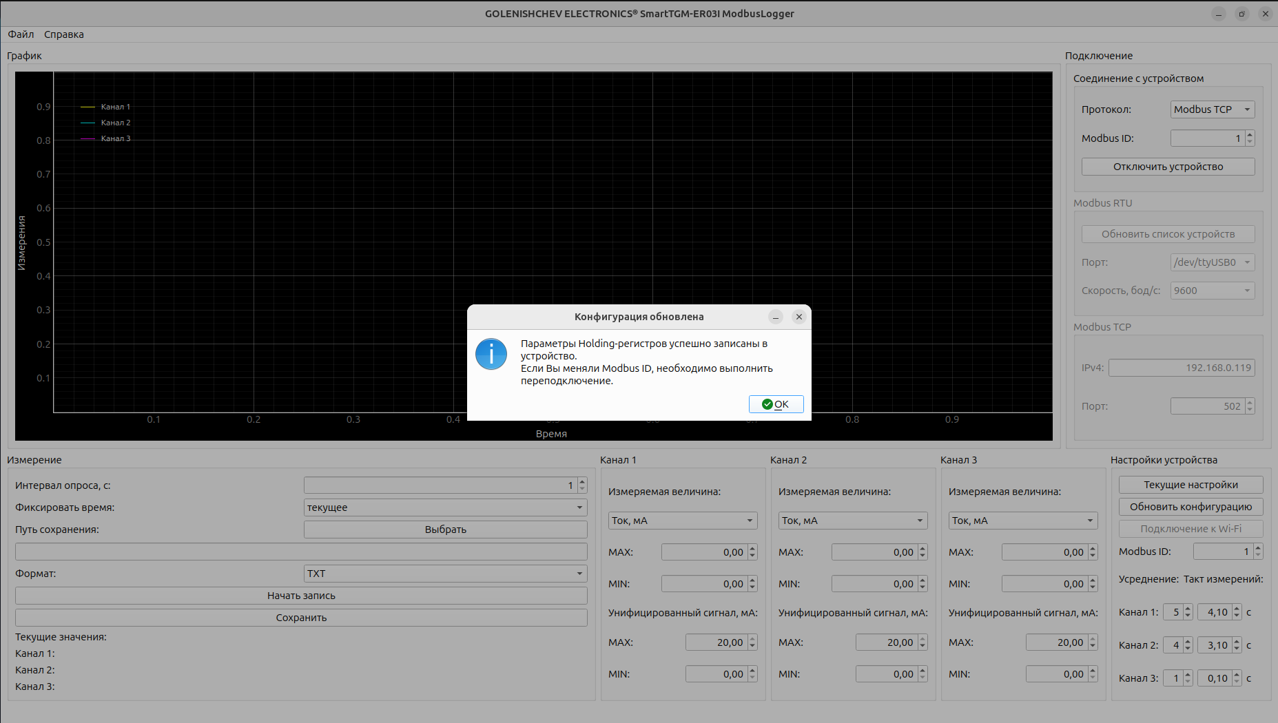 Важно! При изменении значения Modbus ID необходимо отключить устройство, затем подключить его с новым значением Modbus ID к программе.