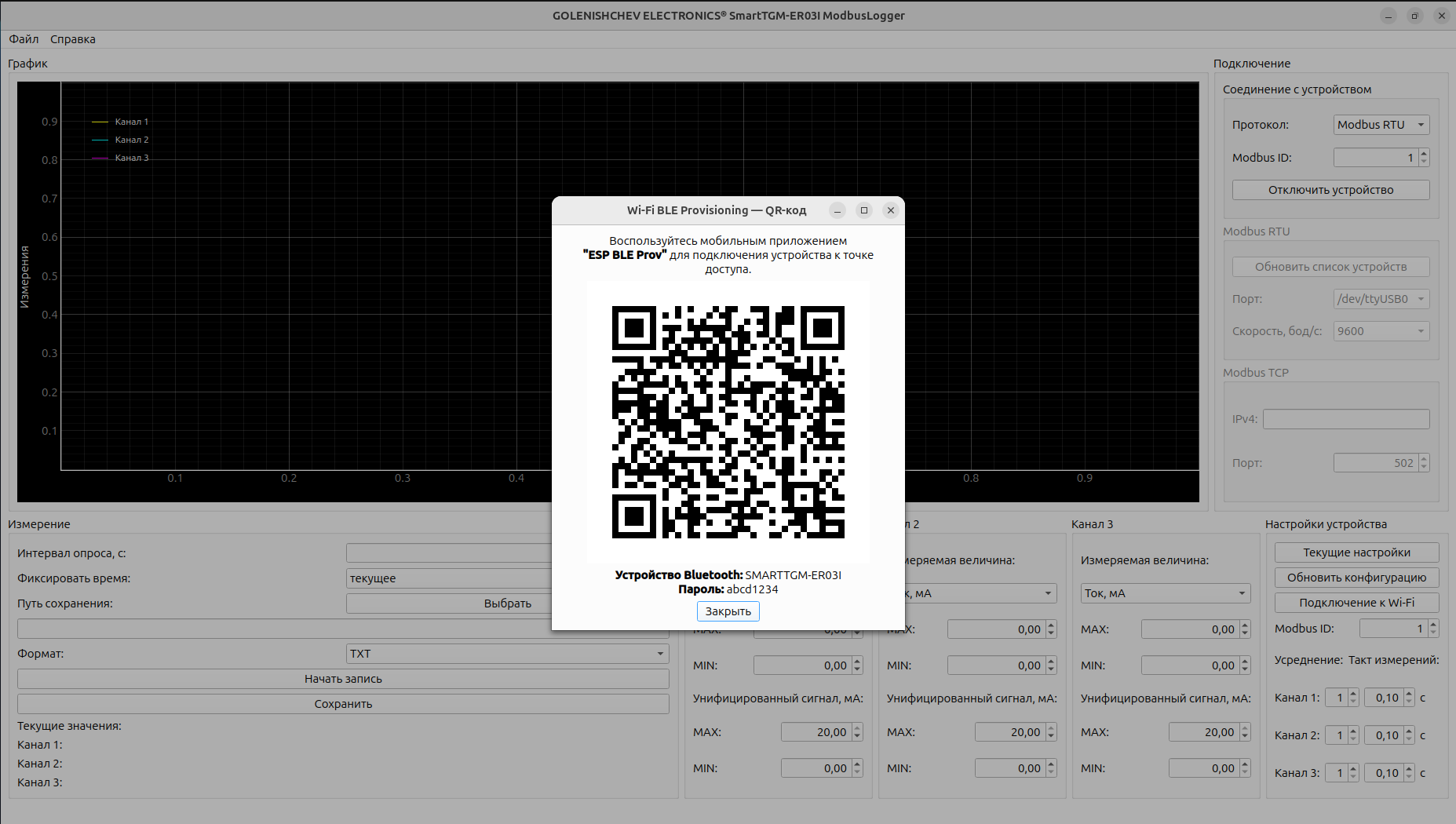После успешного подключения нажмите на кнопку “Подключение к Wi-Fi”. Если версия микропрограммы прибора поддерживает подключение к точке доступа, то вы увидете QR код, который можно сканировать в мобильном приложении “Wi-Fi BLE Prov” от Espressif Systems (рисунок 6). Также в появившемся окне отображаются параметры BLUETOOTH для подключения через это же приложение в случаях, когда невозможно считать QR-код с телефона.