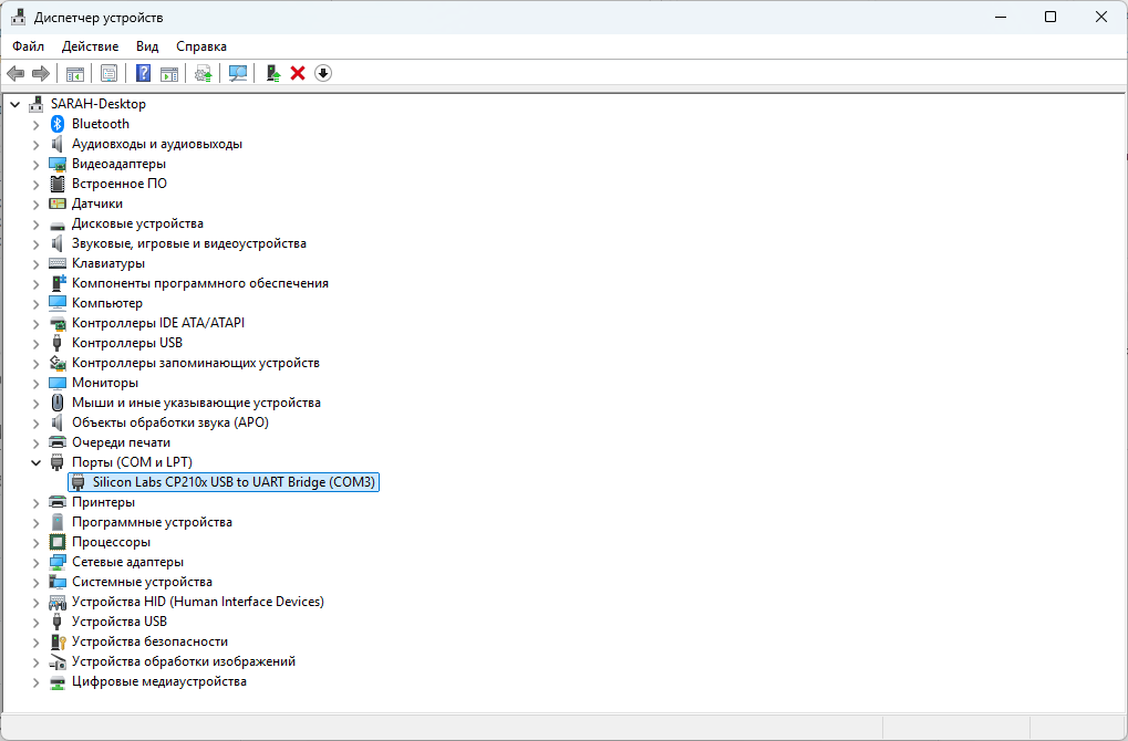 Запустите программу, подключите прибор к ПК через интерфейс USB, преобразователь интерфейсов RS-485/USB. При последовательном подключении устройства оно будет отображаться в диспетчере устройств операционной системы Microsoft Windows. Для подключения устройства по USB необходимо установить драйвер для микросхемы интерфейса CP2102 для операционной системы Microsoft Windows с официального сайта (CP210x Universal WIndows Driver). После установки драйвера устройство должно отображаться корректно, как виртуальный COM-порт (рисунок 2).