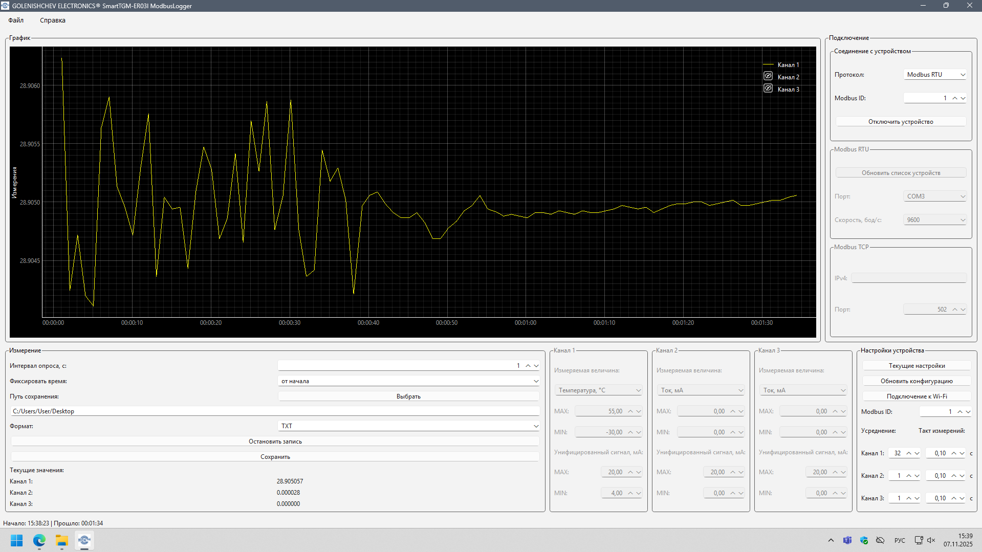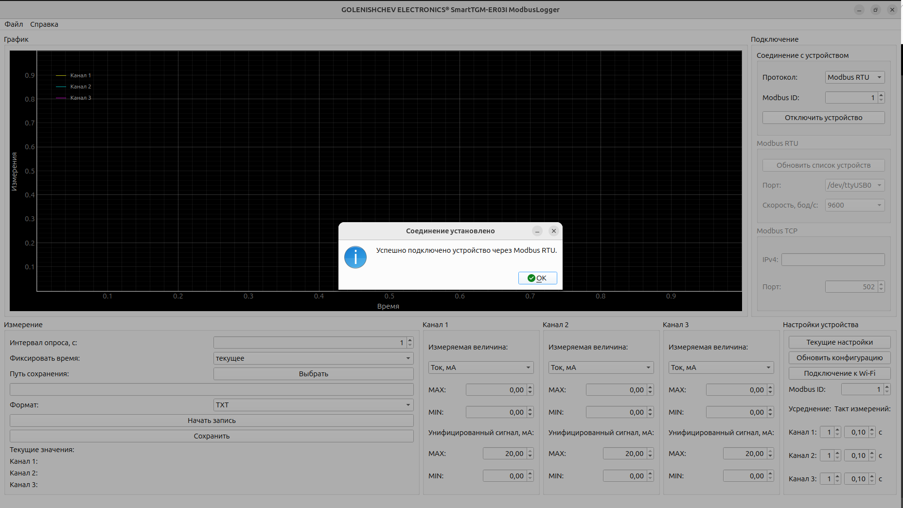 Программа устанавливает соединение с устройством по протоколу Modbus RTU или Modbus TCP в зависимости от выбранного варианта подключения. Может осуществлять запись/чтение регистров устройства в удобной форме. Позволяет проводить измерения с заданным временным интервалом, сохранять измеренные значение в файл (форматы TXT, CSV, XLSX), визуализировать результаты измерений в заданных единицах измерения для каждого канала.
